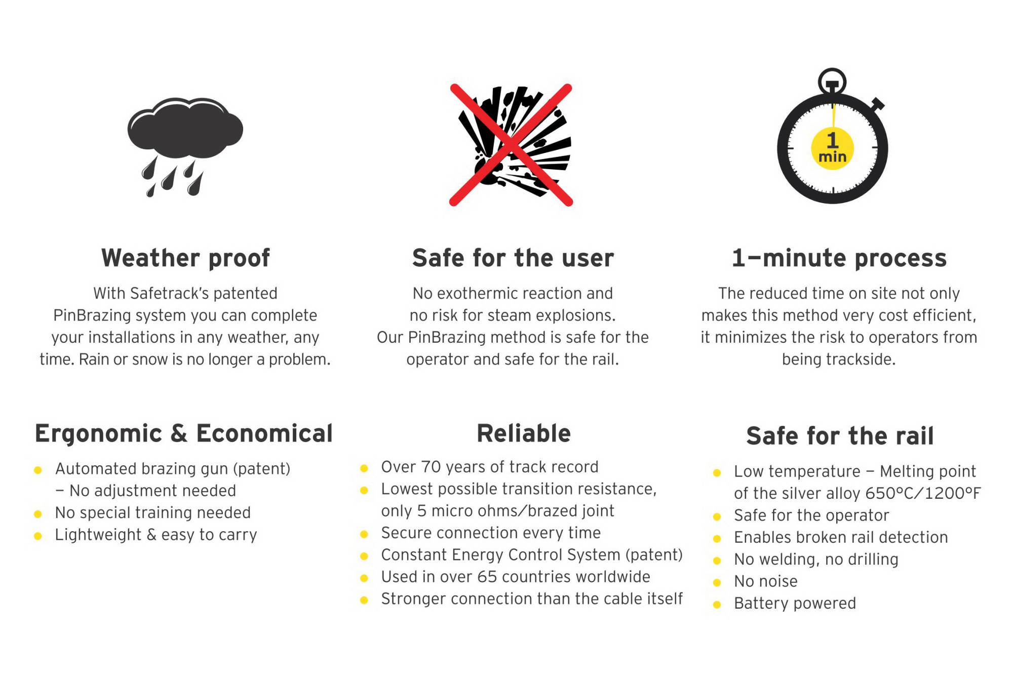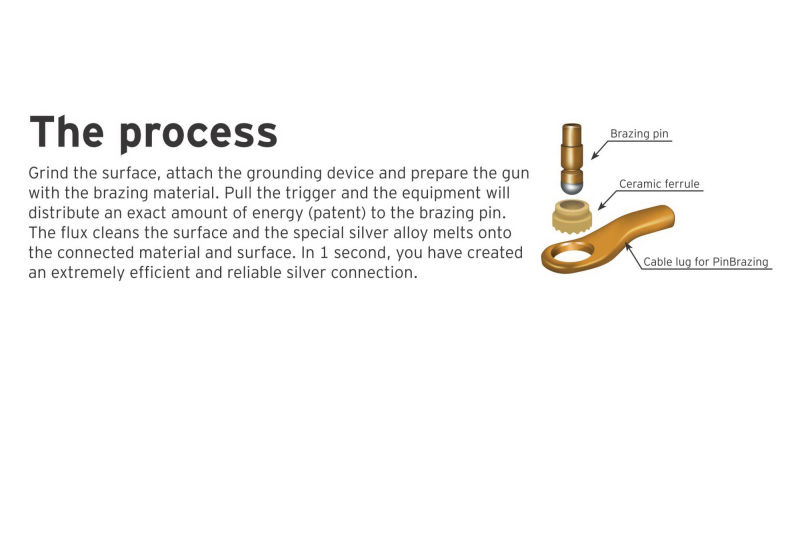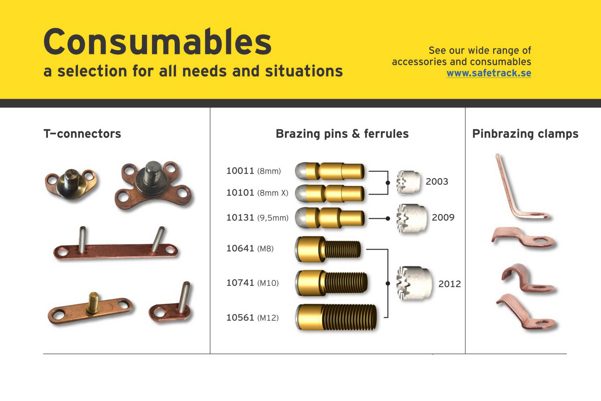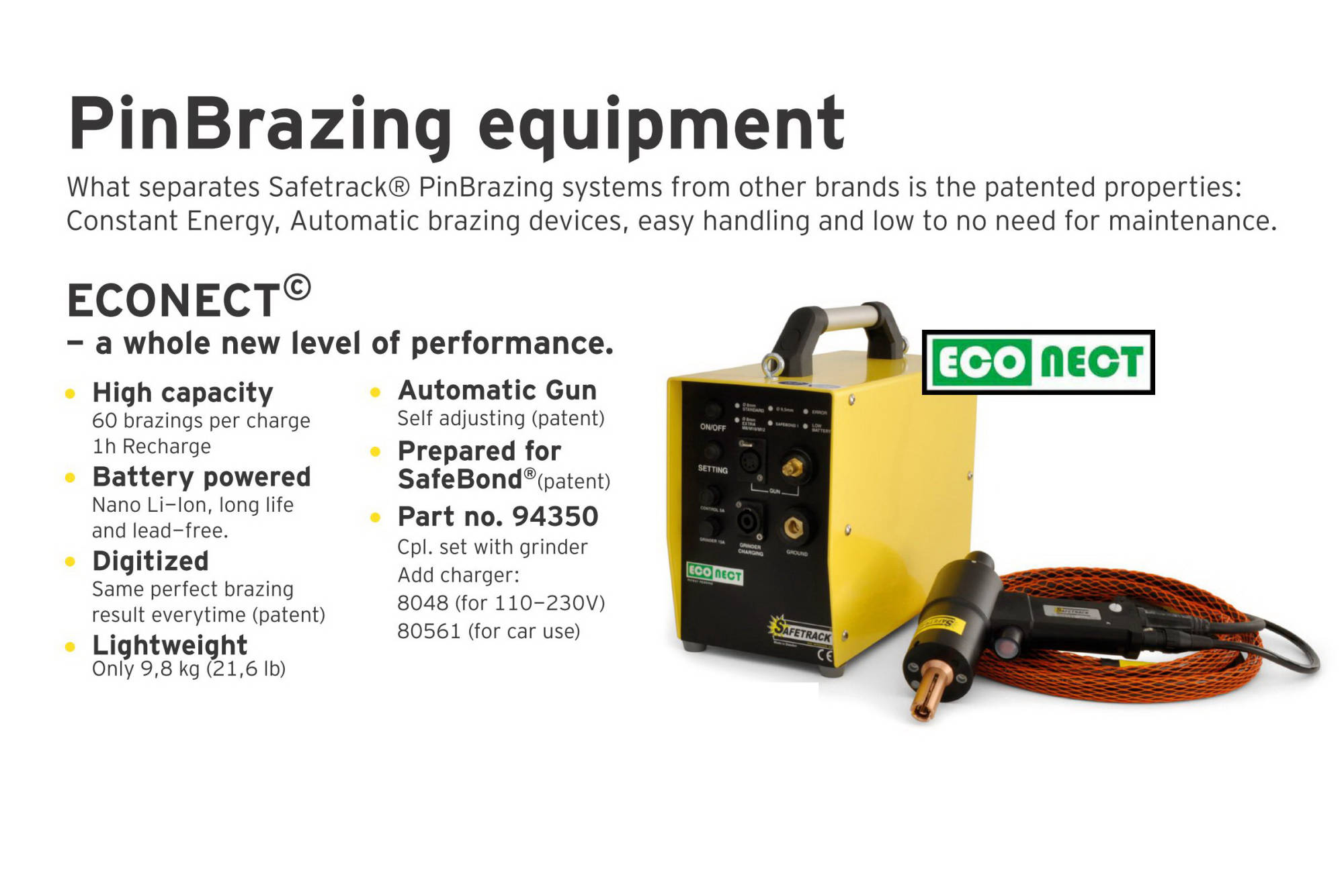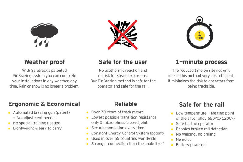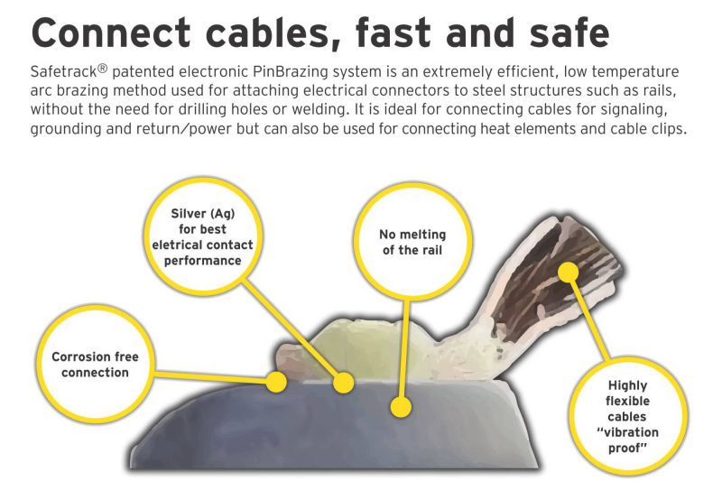 Safetrack® patented electronic PinBrazing system is an extremely efficient, low temperature arc brazing method used for attaching electrical connectors to steel structures such as rails, without the need for drilling holes or welding. It is ideal for connecting cables for signaling, grounding and return/power but can also be used for connecting heat elements and cable clips.